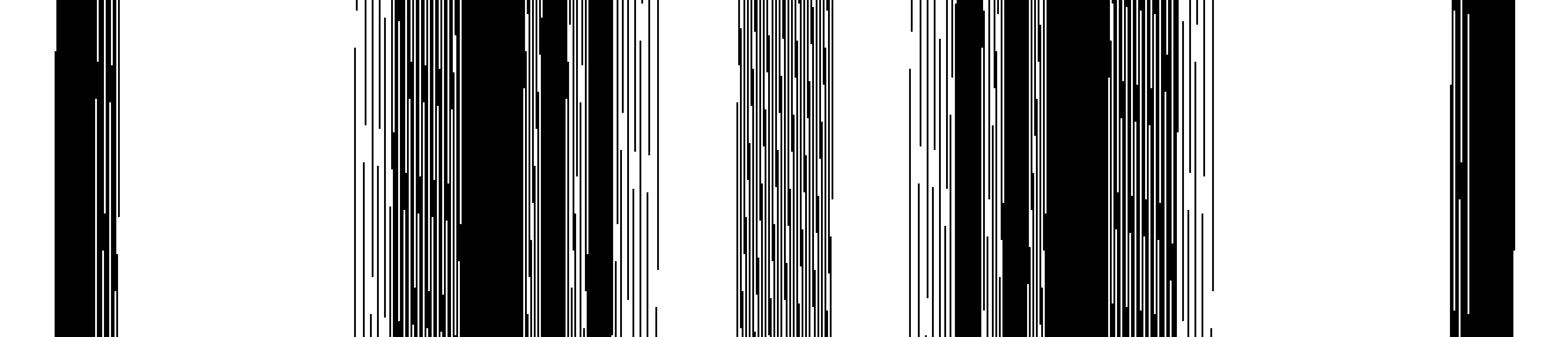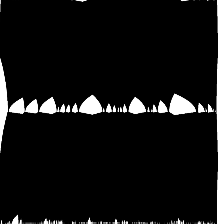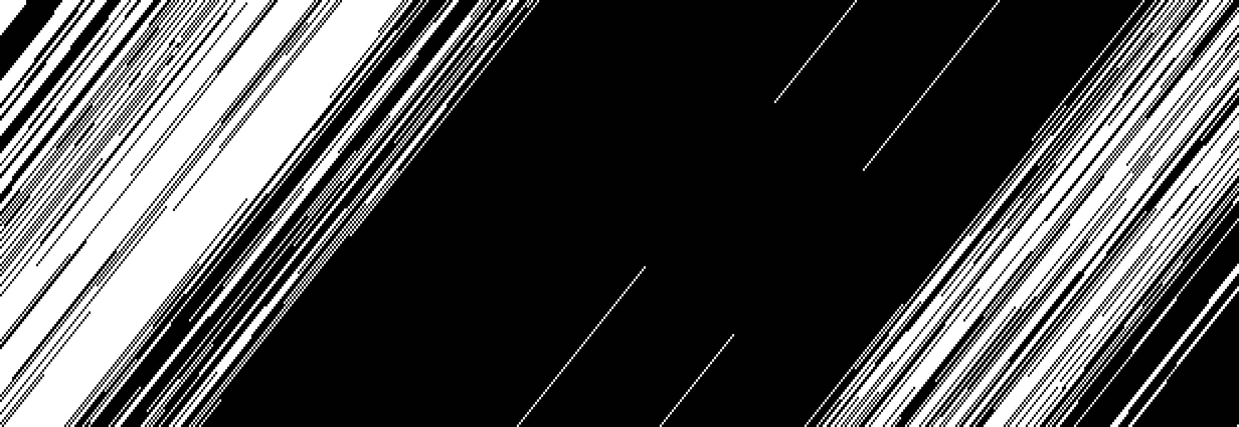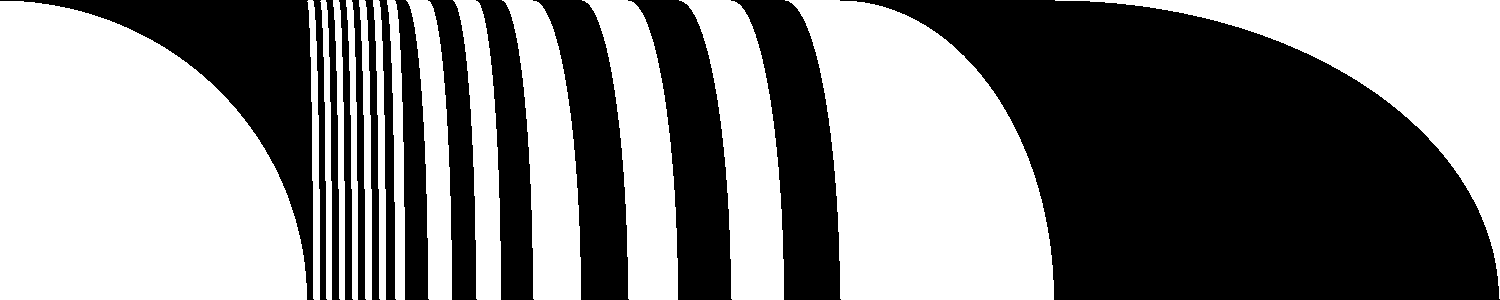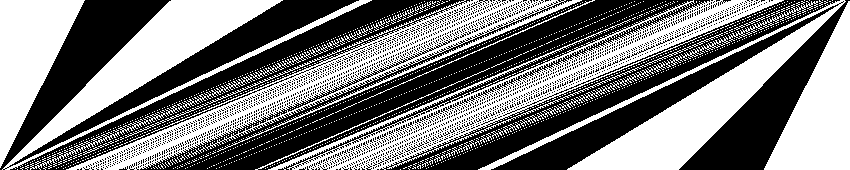 Tout commence par un rythme binaire, une succession de parties noires et blanches, de longueurs variables. C’est cette structure qui, dans le cas présent, signifie le rythme. Le rythme se construit avec un ensemble de vocabulaire simple. Parmi ces briques, nous trouvons, le bruit, qui est une succession aléatoire de longueurs blanches et noires. Il existe aussi des progressions par longueurs, des gradients, des répétitions de motifs, des symétries, des rotations, diverses possibilités de mélange, et bien sûr les combinaisons de tout ceci. C’est un résumé du vocabulaire minimal de construction du rythme binaire.